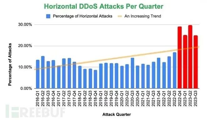 不仅DDoS攻击的数量在2023年有所增加,而且攻击类型的种类也较前几年有所增加。横向DDoS攻击自2022年第四季度以来显著增加。直到2022年第三季度,Akamai观察到的DDoS攻击中只有不到20%被归类为横向攻击(见图5)。但在2022年第四季度到2023年第三季度的12个月期间,Akamai持续观察到近30%的DDoS攻击是横向和多目的地攻击,增长了近50%。