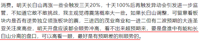 消费。长白山因异动跳水,目前正在规避3天20%,短期看五日趋势,但波动应该会降下来了。补涨看九华旅游、大连圣亚,今天他俩跟长白山分离是个小节点,明天倾向于接力,我暂时确定不了。