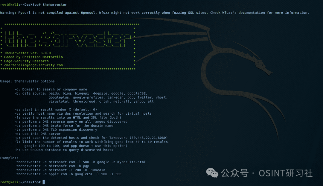 theHarvester 是一款实用的开源情报工具,旨在从众多公共来源收集电子邮件、名称、子域、IP、URL 等。在我们的行动中,我们使用 Harvester 来自动化初步的外部侦察工作。