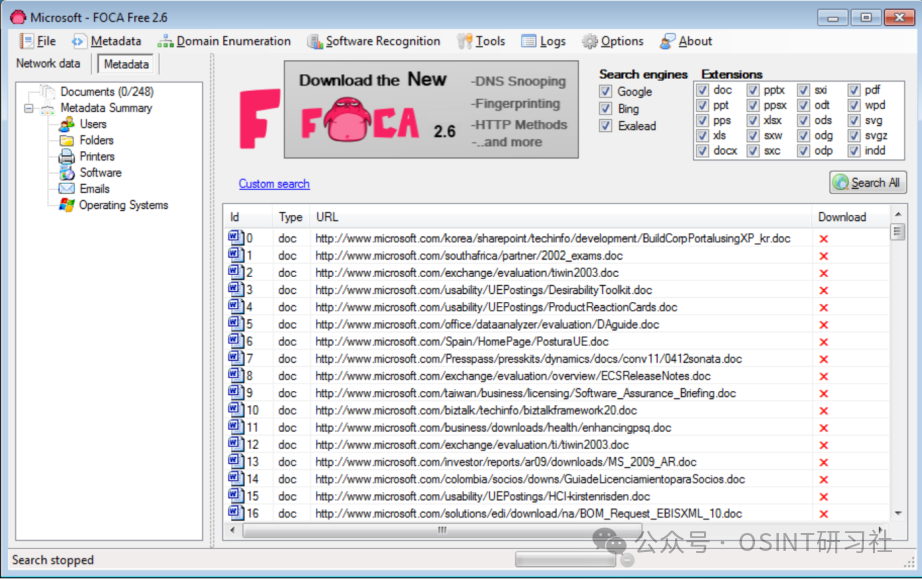 FOCA(组织指纹识别)是一种开源 OSINT 工具,旨在通过从公共文档和文件中提取元数据和隐藏信息来揭示组织的数字足迹。在我们的运营中,我们在调查过程中使用 FOCA 从 PDF 和 DOCX 等文档格式收集情报。