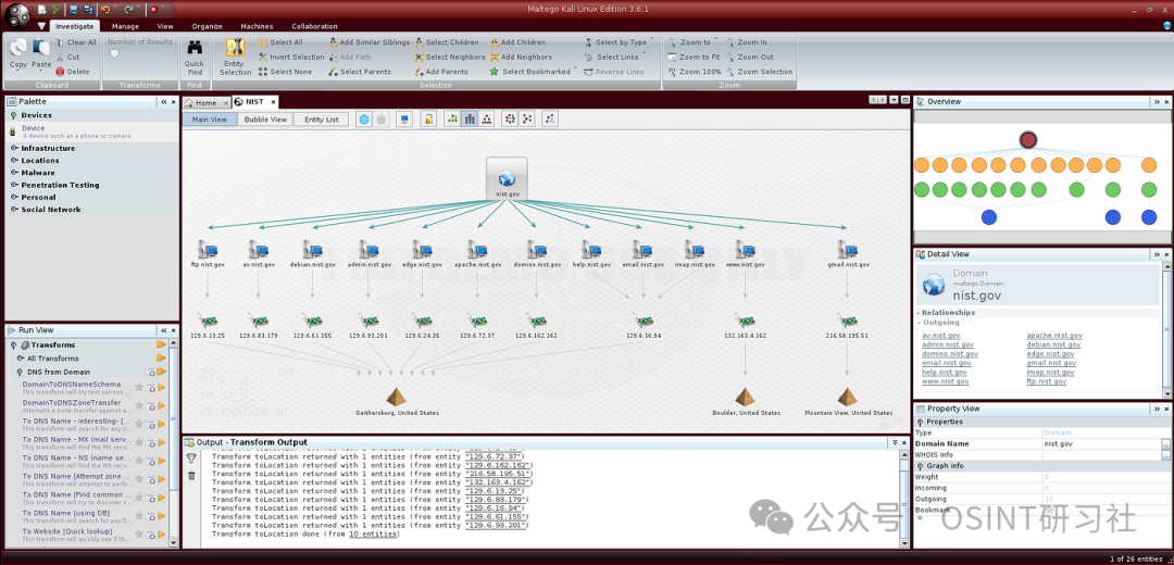 Maltego 的运行方式是获取初始数据点(例如短语、名称、网站、域等),将它们转换为图形网络地图,以说明相关实体之间的连接和关联。这种图形表示简化了对复杂的现实世界相互关系的理解,提供了比仔细阅读数据表更直观的方法。