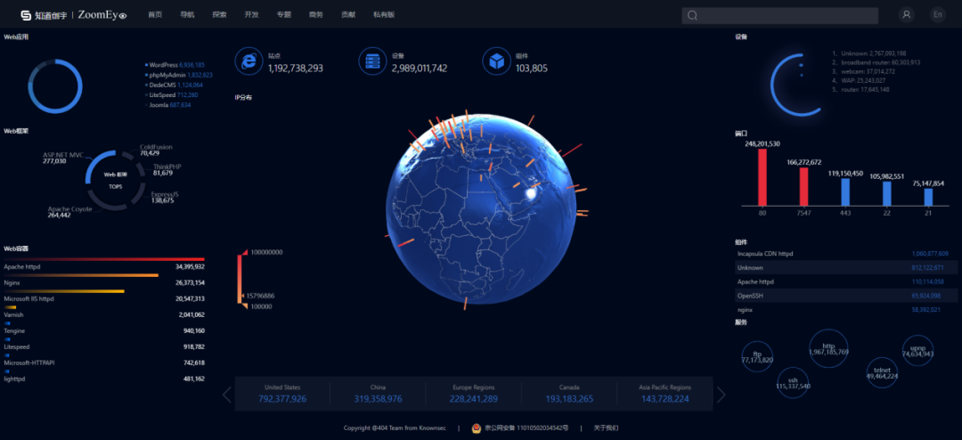 ZoomEye 收录了全球互联网空间中的各种资产维度,如设备、网站及其地理位置、服务、组织、恶意 IP 和目标价值等,实现全球资产发现、漏洞影响范围关联分析、潜在威胁发现等。