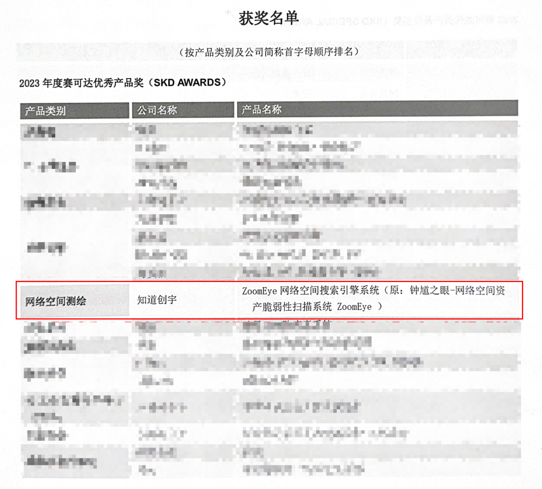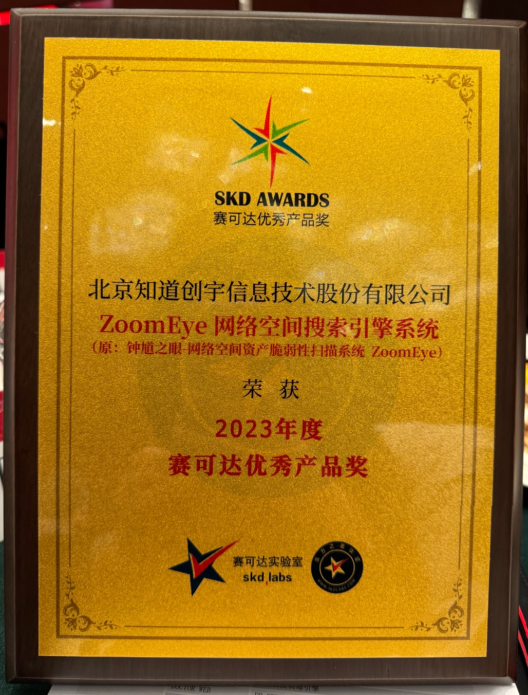 在全球网络威胁日益严峻的今天,ZoomEye 以卓越的技术实力和性能表现,成功脱颖而出,荣获了 2023 年度赛可达优秀产品奖(SKD AWARDS)。这一荣誉不仅肯定了知道创宇在网络空间安全领域的贡献,也为全球用户提供了一个值得信赖的安全防护解决方案。未来,知道创宇将继续秉持创新、专业、可靠的理念,与全球用户共同应对网络空间的挑战与威胁。