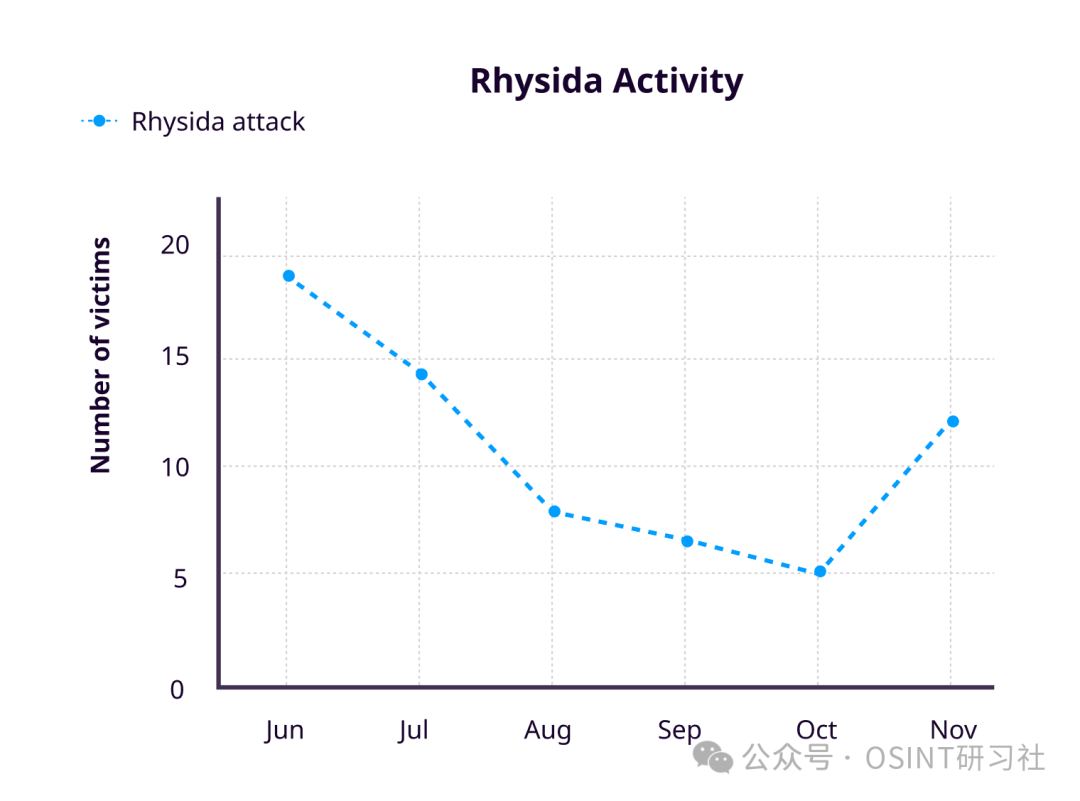 下图显示了 Rhysida 活动的统计数据。