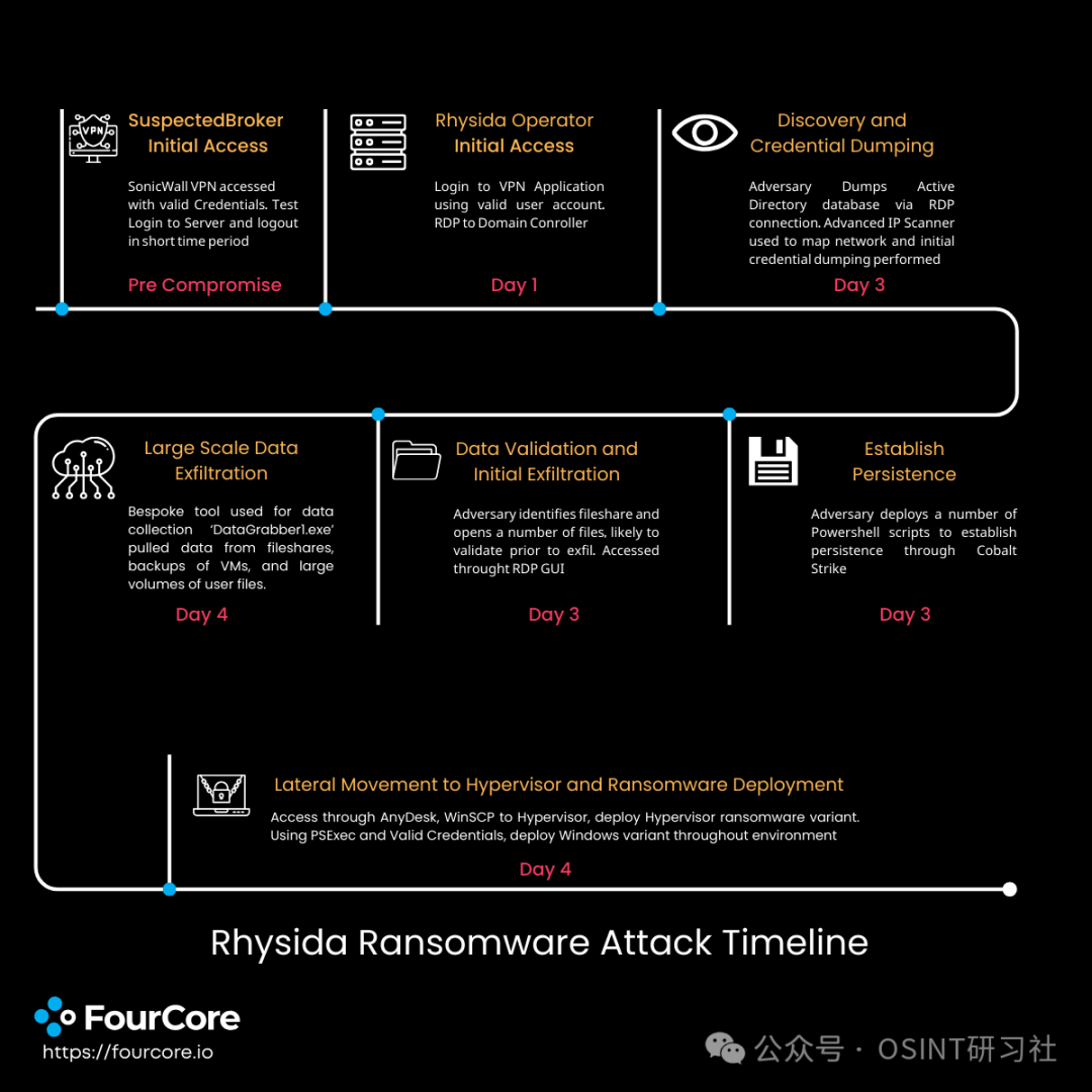 Rhysida 勒索软件运营商利用最近的漏洞或利用初始访问经纪人在暗网市场上购买的有效凭证,机会主义地危害受害者。在其链的加密阶段,他们利用自己的 Rhysida 有效负载或 RaaS 生态系统中可用的其他勒索软件有效负载,例如 QuantumLocker、BlackCat 和 Zepplin 等。在一些案例中,该组织没有加密受害者的文件,而是仅使用泄露的被盗数据进行勒索。