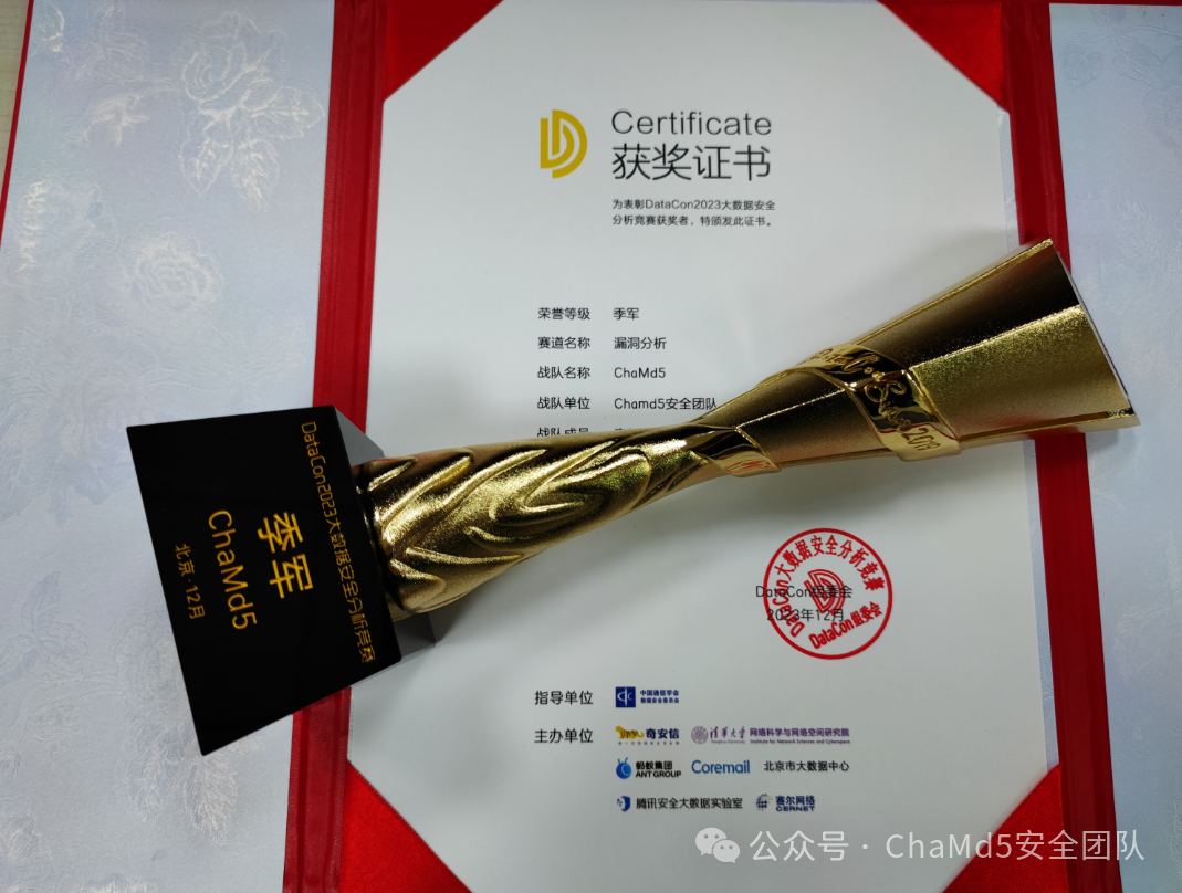 ChaMd5安全团队成立于2016年,专注于算法加解密、安全漏洞挖掘、CTF竞赛及安全人才培养。至今团队成员有200+人,分别来自阿里、滴滴、启明星辰、绿盟、知道创宇、奇安信、永信至诚、360、陌陌、牛盾、无声信息等安全公司,且也有部分在校学生与自由职业者。自团队成立以来,已荣获来自华为、微软、蚂蚁金服、百度、京东、滴滴、唯品会、联想、爱奇艺等多家企业致谢,向企业所报告漏洞合计已超过10w+。团队成员也曾参与ZCTF、NJCTF、DDCTF、XCTF、百度杯CTF等多项CTF竞赛。