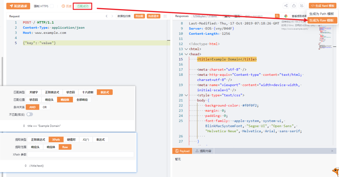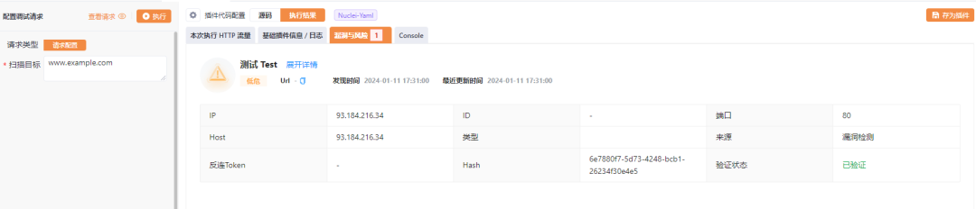 rsp, req = poc.HTTP(`GET / HTTP/1.1Host: www.example.com`)~node ,err = xpath.LoadHTMLDocument(rsp)die(err)res := xpath.FindOne(node , "//title/text()")title = res.Dataif title == "Example Domain" {risk.NewRisk("www.example.com",risk.title("测试Title"),risk.description("测试"),risk.severity("low"),risk.request(req),risk.response(rsp))}
