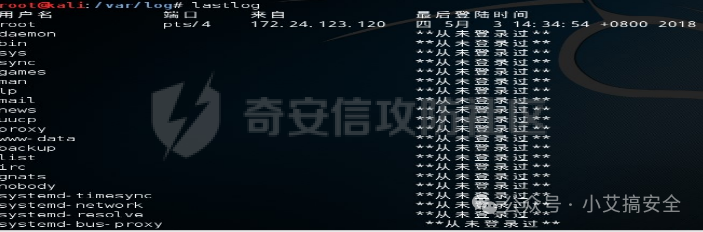 /var/log/lastlog 记录所有用户的最近信息。这不是一个ASCII文件,因此需要用lastlog命令查看内容