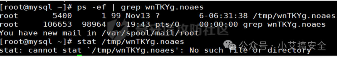 使用 ps 查看挖矿程序进程,程序路径为/tmp/wnTKYg.noaes,被程序自身删 除前已经加载到内存中,可进行挖矿操作: