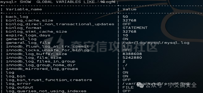 数据库日志以常用的数据库 Mysql 数据库为例。Mysql 数据库有五种日志,错误日志、查询日志、慢查询日志、更新日志、二进制日志,重点关注查询日志;查看是否开启查询日志: