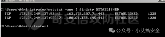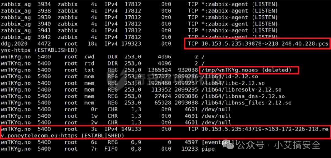 使用lsof查看对外连接情况,发现wnTKYG.noaes对218.248.40.228:8443和163.172.226.218.rev.poneytelecom.eu:443发起TCP外连请求;