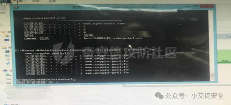 登录的这台机器可以看到 DNS 解析过该域名,由此判断该机器中了挖矿木马,使用相关工具分析发现其中 csrss.exe 进程为伪装的系统进程
