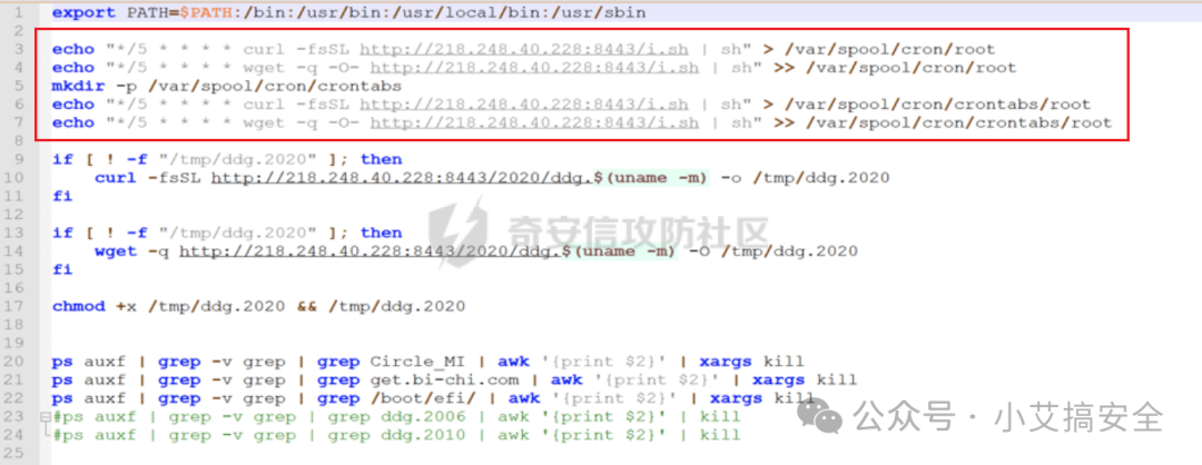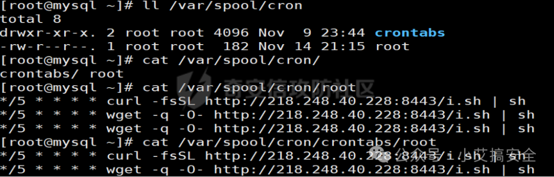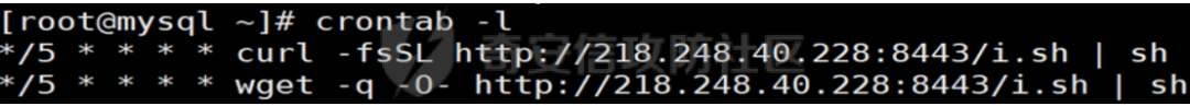 查看定时任务,发现攻击者在计划任务中留下了定时启动脚本,删除挖矿程 序后可通过每隔 5 分钟执行一次计划任务中的后门脚本重新下载启动;