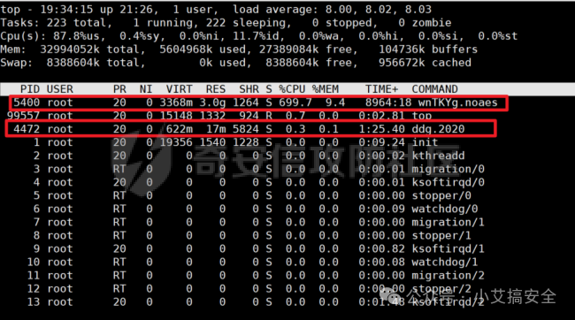 使用top查看到wnTKYG.noaes进程占用大量CPU资源,另外ddg.2020也是可疑进程,wnTKYG.noaes为挖矿病毒主进程