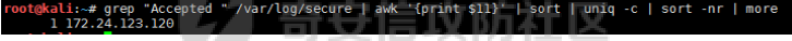 \==grep "Accepted " /var/log/ secure | awk '{print $11}' | sort | uniq -c | sort -nr | more==