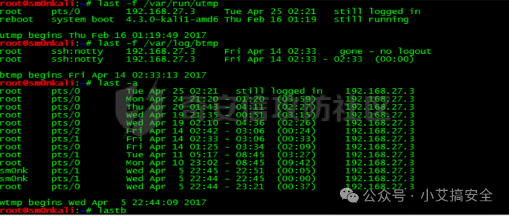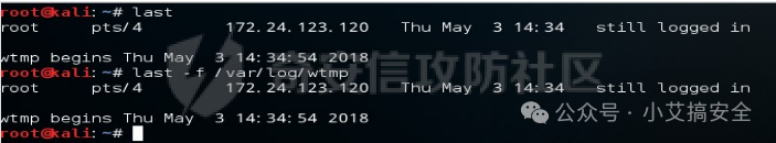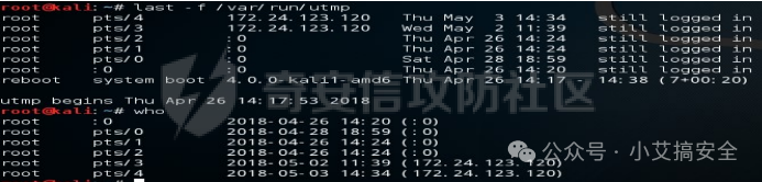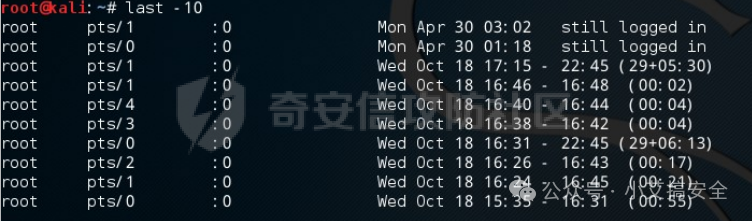 5.1.1、/var/log/wtmp /var/log/wtmp 是一个二进制文件,记录每个用户的登录次数和持续时间等 信息; last 命令 last 命令用于显示用户最近登录信息。单独执行 last 命令,它会读取 /var/log/wtmp 的文件,并把该给文件的内容记录的登入系统的用户名单全部显示出来;