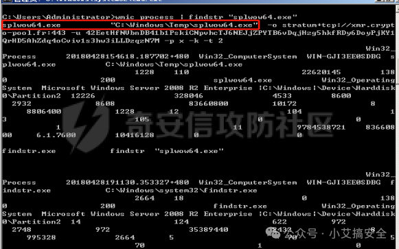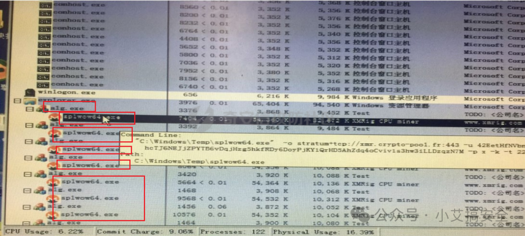 通过查看系统进程后发现多个异常进程:alg.exe、splwow64.exe。通过对进程参数进行判断判定该进程是恶意挖矿程序
