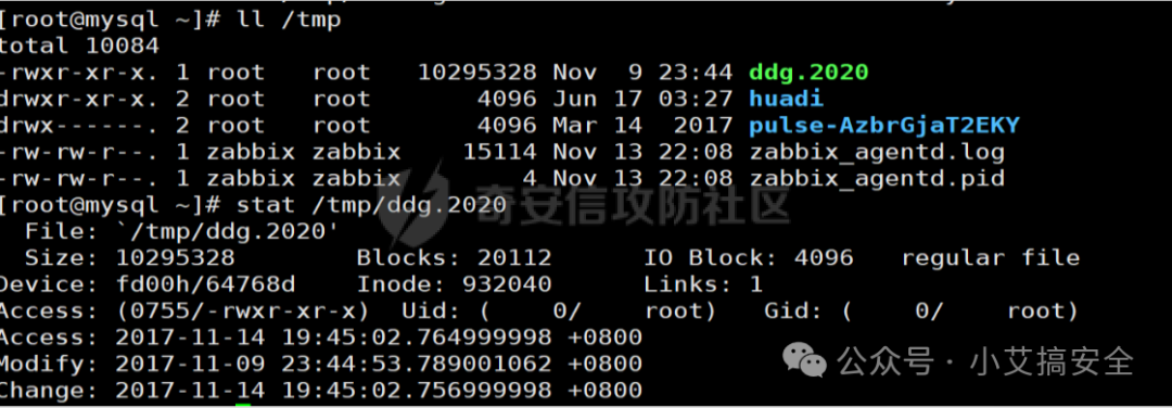 ddg.2020 为挖矿病毒守护和传播进程,从运行记录的时间戳得知该操作存在 于 11 月 9 日 23 时 44 分,攻击者已于该时间进入服务器: