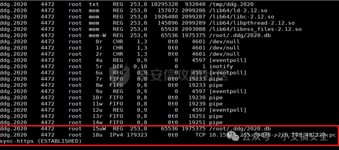 使用 lsof 查看对外连接情况,发现 ddg.2020 对 218.248.40.228:8443 发起 TCP 外连请求: