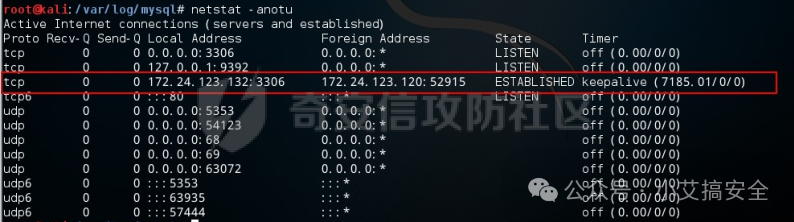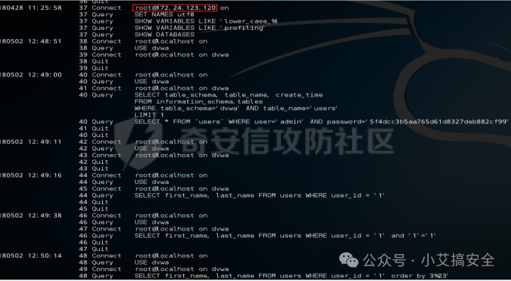 查看数据库文件:路径为/var/log/mysql/,记录一次数据库的连接、查询和退出中间的数据库操作;