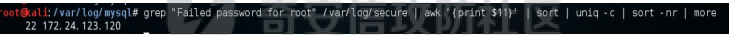 查看爆破主机的ROOT账号的IP: grep "Failed password for root" /var/log/secure | awk '{print $11}' | sort