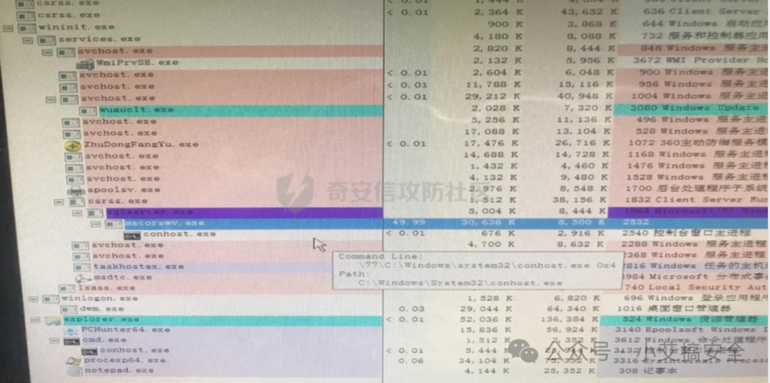 通过该进程有 2 个派生进程 sqlserver.exe 和mscorswv.exe,其中 sqlserver.exe 为 loader 程序负责加载 mscorswv.exe 和配置文件: