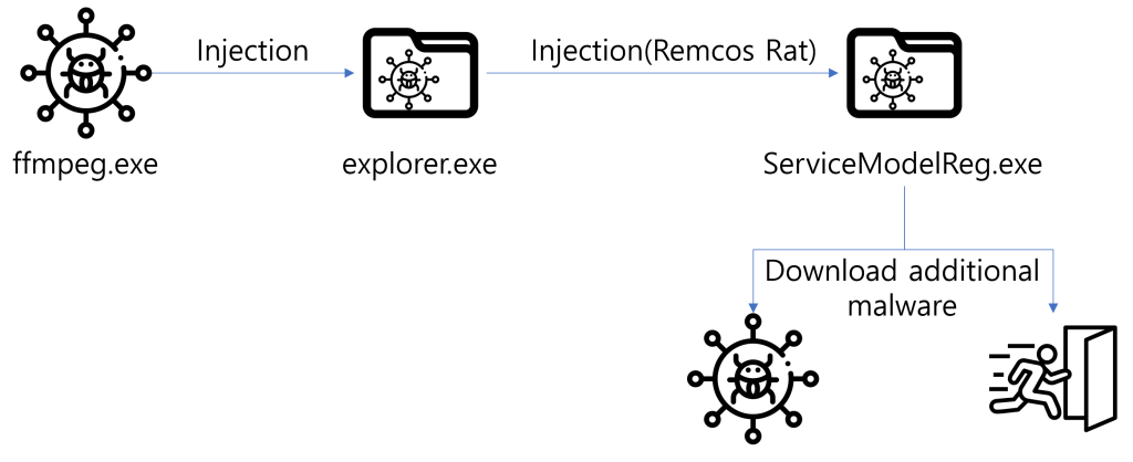 近日,AhnLab的研究人员发现名为Remcos RAT的远程访问木马 (RAT) 通过网络硬盘在韩国伪装成成人主题游戏进行传播。WebHard是网络硬盘的简称,是国内流行的在线文件存储系统,用于上传、下载和共享文件。虽然网络硬盘过去曾被用来传播njRAT、UDP RAT 和 DDoS 僵尸网络恶意软件,但 AhnLab 安全应急响应中心 (ASEC) 的最新分析表明,该技术已被用来传播 Remcos RAT。在这些攻击中,用户被诱骗打开诱杀文件,将其冒充为成人游戏,这些文件在启动时会执行恶意 Visual Basic 脚本,以运行名为“ffmpeg.exe”的中间二进制文件。这会导致从参与者控制的服务器检索 Remcos RAT。攻击链图如下图所示。