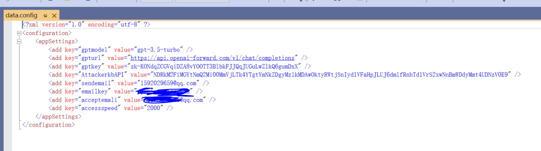 字段介绍gpturl:chatgpt API转发接口gptkey:chatgpt API密钥AttackerkbAPI:AttackerkbAPI密钥 官网https://attackerkb.com/sendemail:发送邮箱地址emailkey:发送邮箱密钥acceptemali:接收邮箱地址accessspeed:数据获取速度