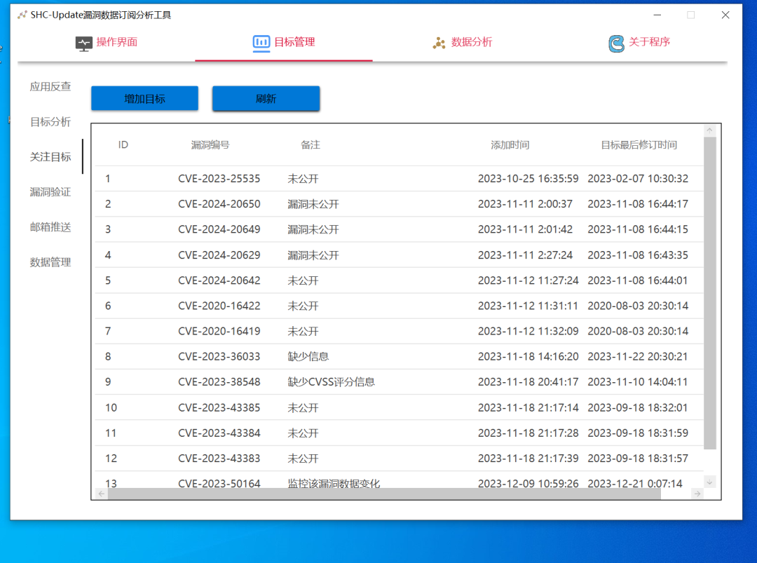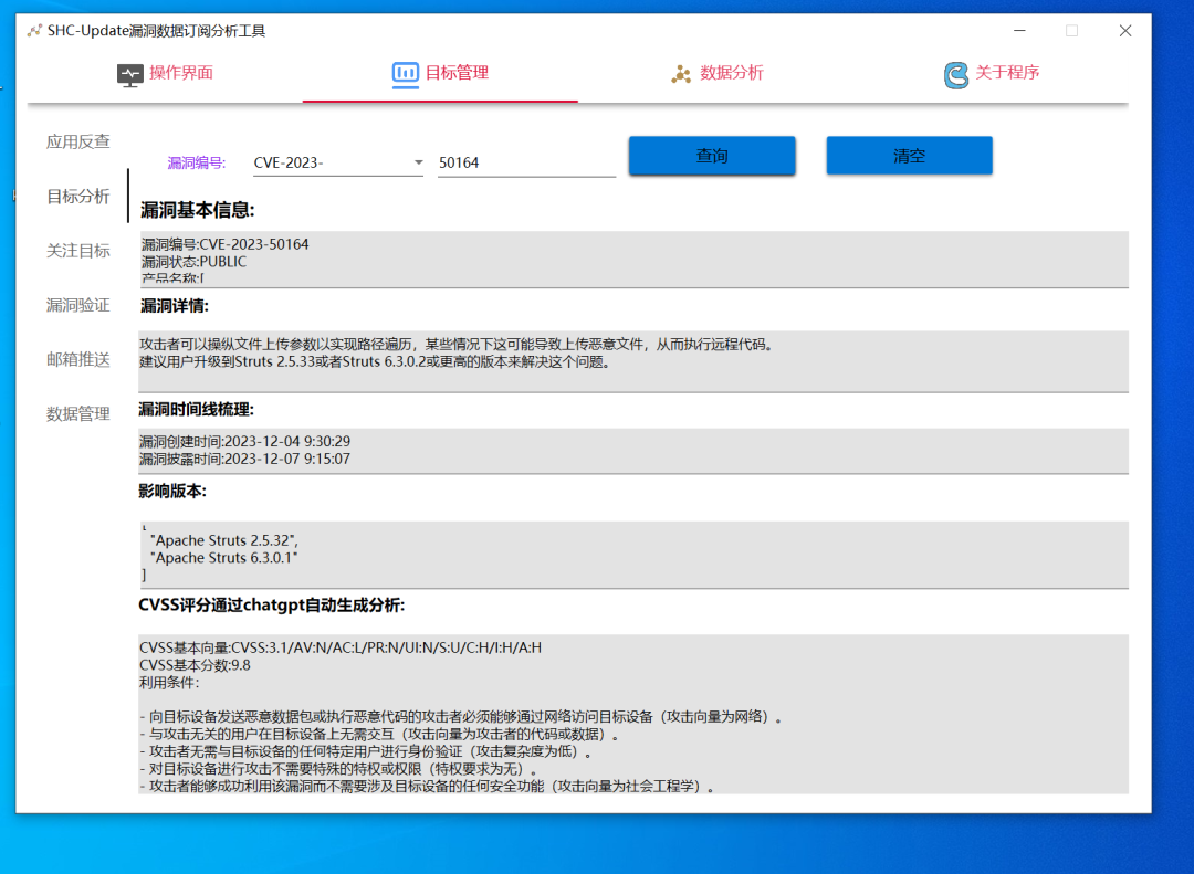 SHC-Update是一款自动化的CVE漏洞数据动态检测工具,其主要功能是根据给定的CVE编号,获取相应漏洞的信息。它能检测目标是否发生了变化,以及变化所涉及的信息。通过使用SHC-Update,用户可以及时了解关注目标的动态情况,并关注CVE漏洞平台的数据收录情况。