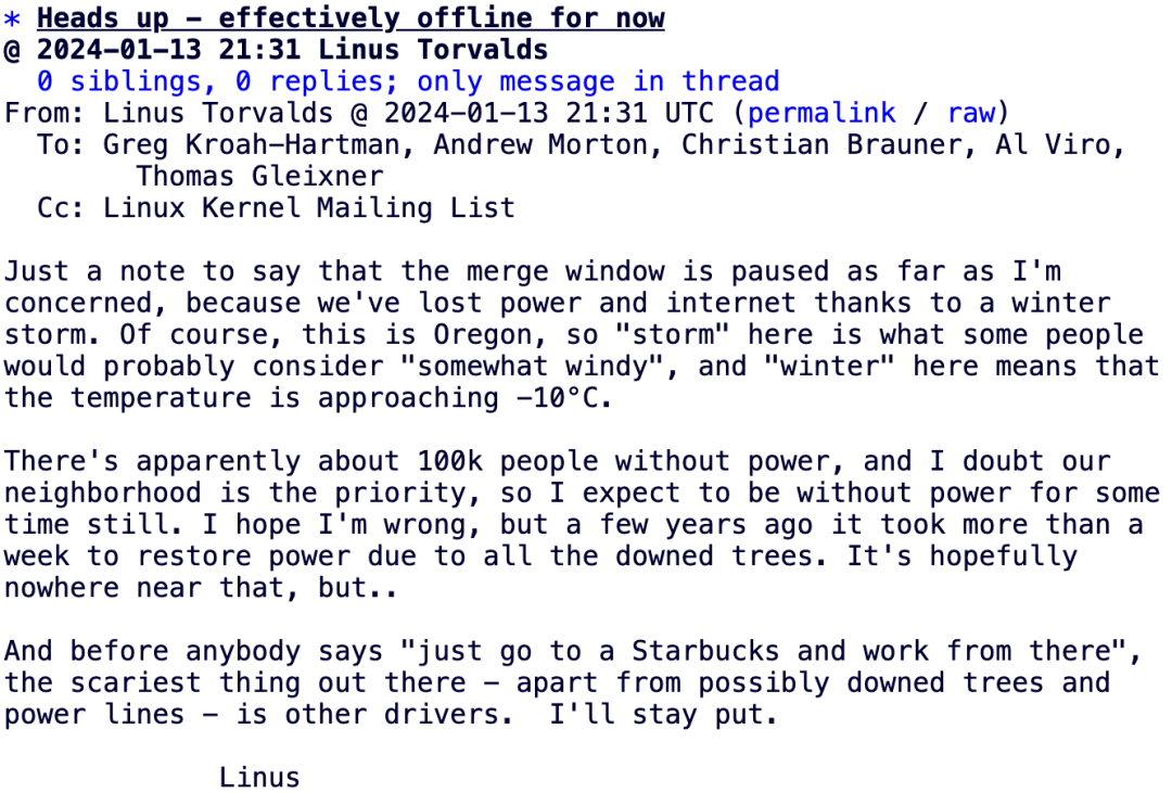 Linus Torvalds 在内核邮件列表宣布,由于他位于美国俄勒冈州波特兰的居住地遭遇严重冬季风暴,导致网络和电力中断,他所在的波特兰附近地区气温降至 -10°C,因此他不得不暂停 Linux 6.8 内核的合并窗口。via https://lore.kernel.org/lkml/Linus 在 1 月 7 日发布 Linux 6.7 内核,随后开启 6.8 合并窗口,预计持续两周,但上周末合并窗口处于中间阶段时,他居住的地方因冬季风暴而断电断网。Linus 称恢复电力和网络通常需要比较长的时间,他曾经历过需要一周多时间供电才恢复。俄勒冈州冬季风暴现场图,来自 https://www.opb.org/articleLinus 还表示他没有去星巴克继续工作的打算,因为内核开发并没有重要到需要寻找温暖和 Wi-Fi 的地步。所以按照目前的情况,Linux 6.8 RC1 大概率会推迟发布。相关链接:https://twitter.com/trimet/status/1746303249433718913---END---