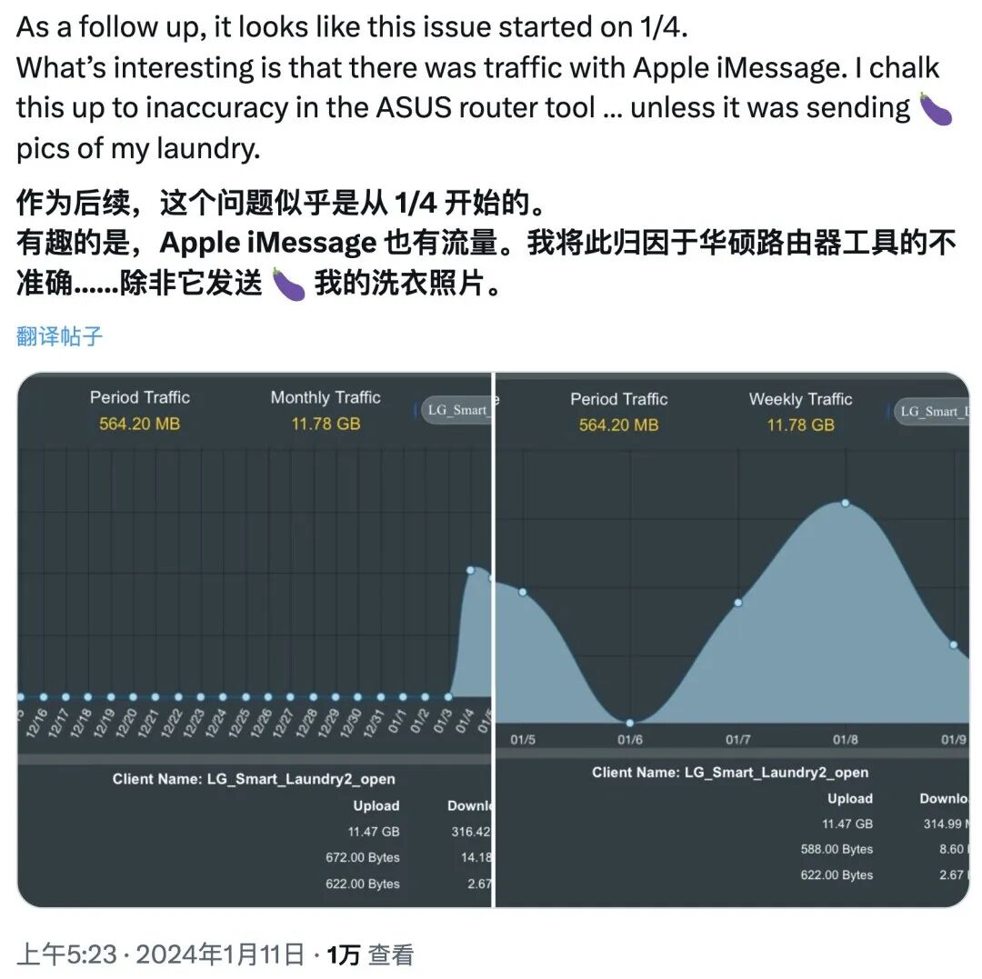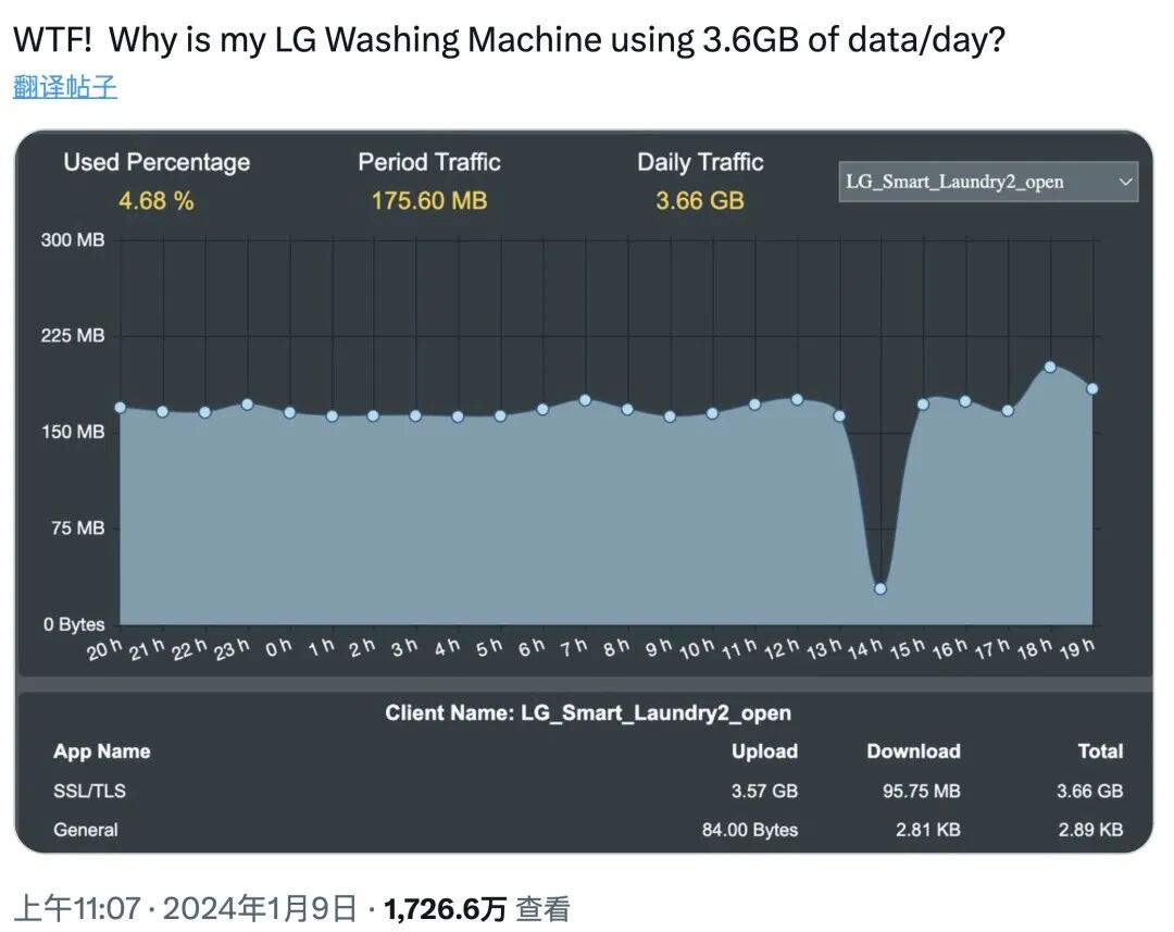 推特用户 Johnie 发帖称自己的 LG 洗衣机每日使用的数据流量高达 3.6GB。根据推文的附图,这是华硕路由器的后台界面,从统计数据来看,这台 LG 洗衣机在一天内的下载数据流量是 100MB 左右,但上传的数据流量高达 3.57GB,占这名用户每天上网流量的 5%。via https://twitter.com/Johnie/status/1744556503183585471据介绍,LG 为具备联网功能的洗衣机提供了名为 SmartThinQ 的应用程序,供用户控制和自动化所有兼容的家用设备。连接洗衣机后,可以下载额外的洗涤程序等功能。但在这种情况下使用的数据量显然有些问题。有人回复称,这台洗衣机可能是被攻击者入侵后用于 “挖矿”,所以才会如此耗费数据流量。Johnie 后续在路由器屏蔽了该设备,以阻止它使用数据流量。一天后,他发布了一篇跟帖,称这很可能只是华硕路由器界面工具的报告不准确。其他一些用户也证实了软件中可能会出现这种错误。via https://twitter.com/Johnie/status/1745194782463508672![]()