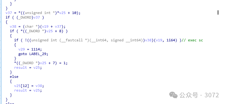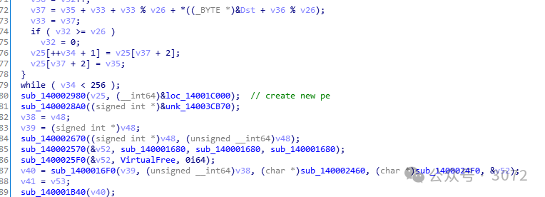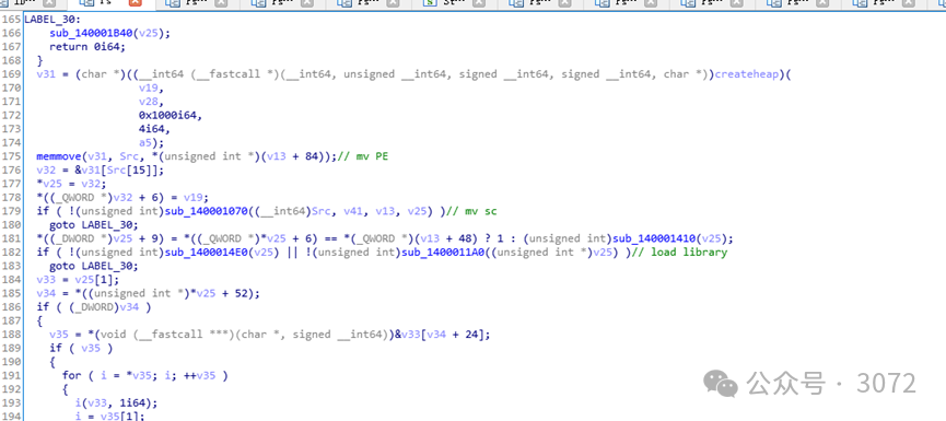 对上一层函数的入口下断点,单步调试,发现函数中用memove进行内存块的移动。对该函数下断点,很快就能定位到shellcode的移动的逻辑,以及执行shellcode的逻辑,这里发现不是通过creatthread来执行的shellcode而是直接call的一个PE文件的text段的地址。