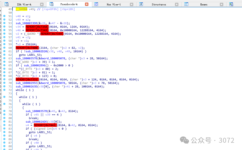 分析时通过x64的内存布局发现shellcode是从RT_DATA段复制出来的PE文件,RT_DATA段本身就有一个PE文件,但是复制的PE文件是该段中动态解密出来的另一个PE,这里可以通过在x64dbg设置RT_DATA段的属性为只读的方式来定位PE解密的代码,当程序产生异常时就成功断在了解密PE的逻辑处。