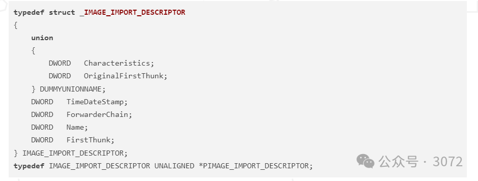 需要关注的主要是3个字段,一个是OriginalFirstThunk,第二个是Name,第三个是FirstThunk,这里FirstThunk指向的位置就是我们常说的IAT表,OriginFirstThunk指向的内容和FirstThunk基本一样,只不过加载到内存中之后IAT会被动态填充为实际的函数地址