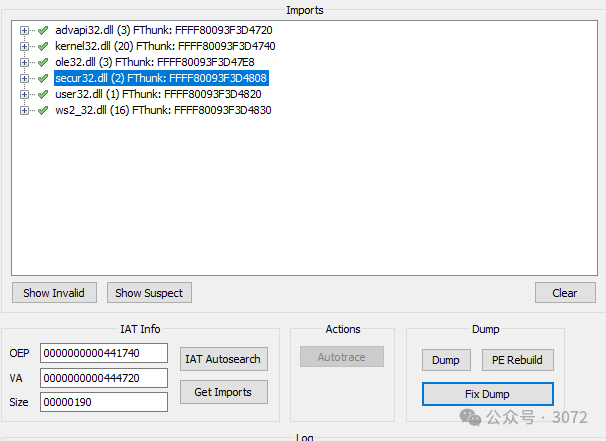 通过x64dbg的scylla的fix dump可以为其添加导入信息,首先调试器运行到shellcode起始部分,通过IAT Autosearch自动找到shellcode的IAT表,之后Get Imports,最后Fix Dump,选择我们从内存中直接dump的文件