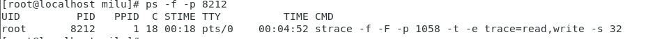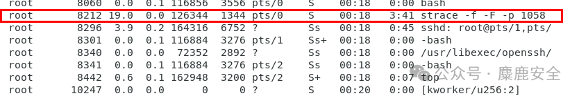 解读一下吧,-f -F是跟踪子进程,-p是获取pid(里面的ps aux是列出所有进程,grep是找到ashd的进程和排除grep本身进程)。-e是跟踪读写相关调用,后面就是一些设置字符串最大长度和输出到指定文件,最后的&是后台运行