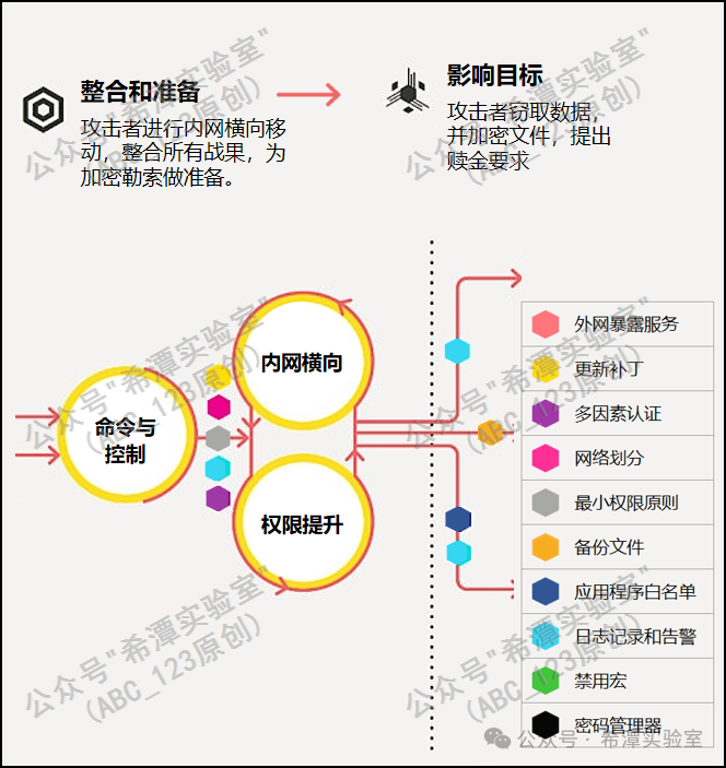 在整合和筹备阶段,设备打补丁、网络划分、执行最小权限原则、实施多因素认证(MFA)以及日志记录和告警措施协同工作,组织攻击者的内网横向和深度拓展操作;