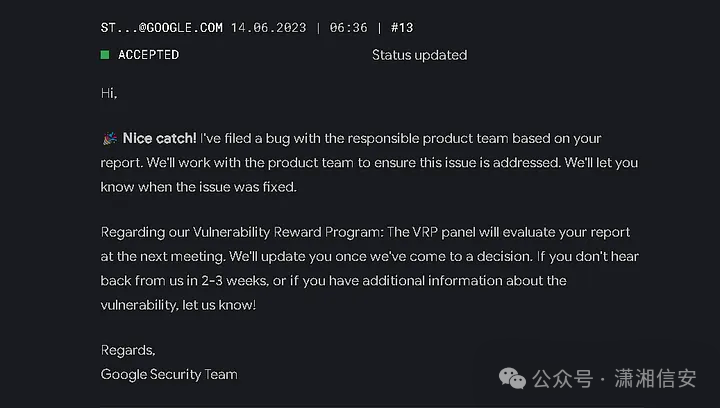 我很高兴收到Google VRP团队的“Nice catch”回复,优先级为P1,严重性为S1,并获得了XXXX美元奖励,因为这是我向Google报告的第一个有效错误。