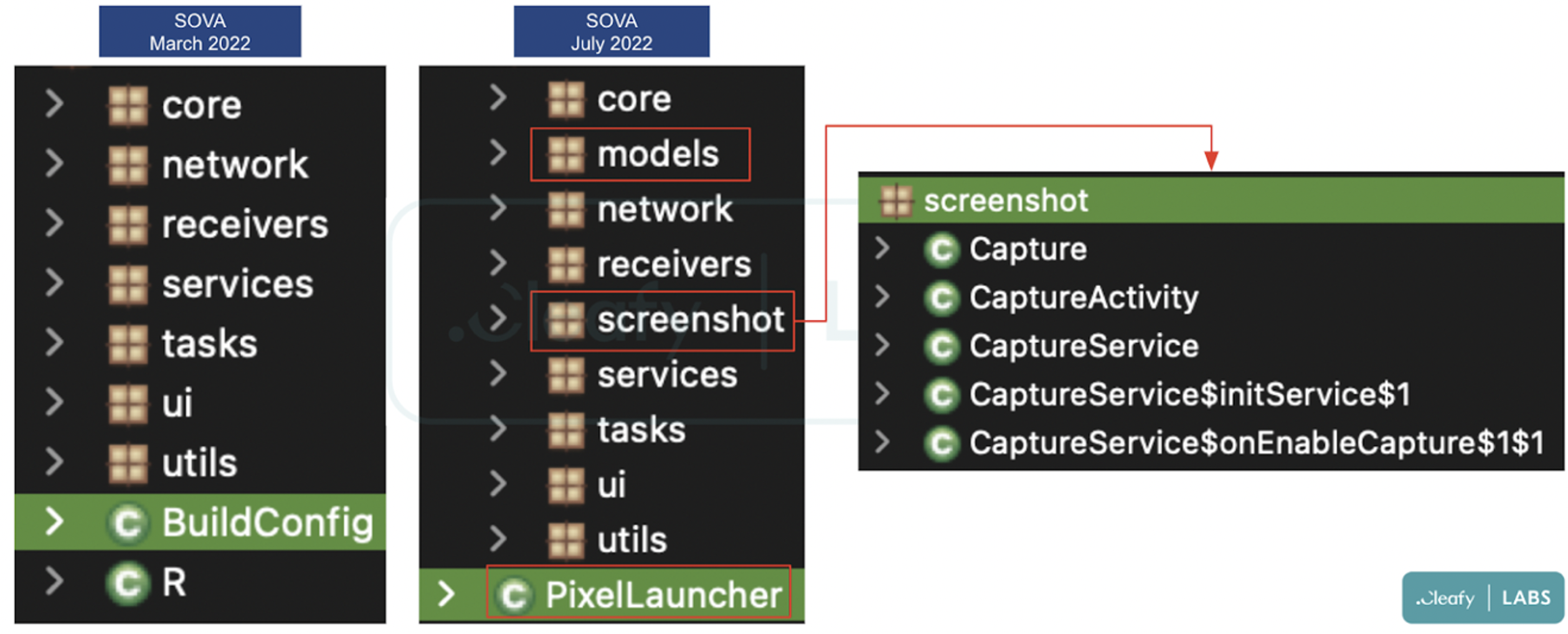 A peculiarity of SOVA v4 is the “core” relocation of the malware. Like the main Android banking trojan, SOVA uses the .apk just to unpack a .dex file which contains the real malicious functionalities of the malware. In the previous version, SOVA stored the .dex file inside the directory of the app, while in the current version it uses a device's shared storage directory (“Android/obb/”) to store it.