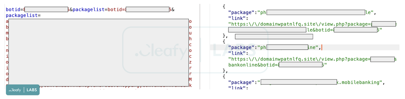 The first version of SOVA had almost 90 targeted applications (including banks, crypto wallet/exchange, and generic shopping apps), initially listed and stored in the packageList.txt file within the assets/ folder. In the latest samples, this file has been removed and the targeted applications are managed through the communications between the malware and the C2.