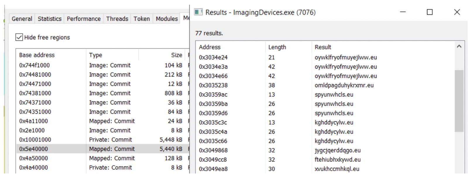 Moreover, at this stage of infection, it is also possible to dynamically extract interesting indicators from memory, for example, a list of Ramnit C2 controllers generated from their DGA algorithm, as shown in the following figure: