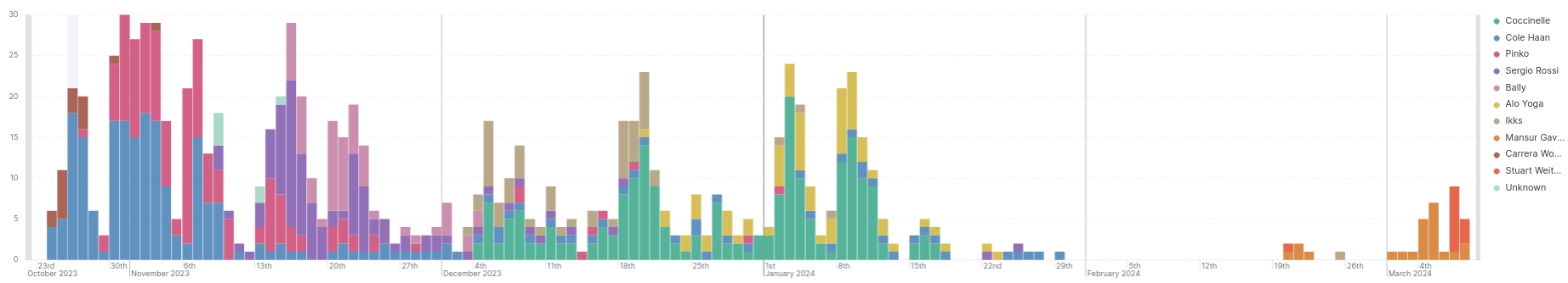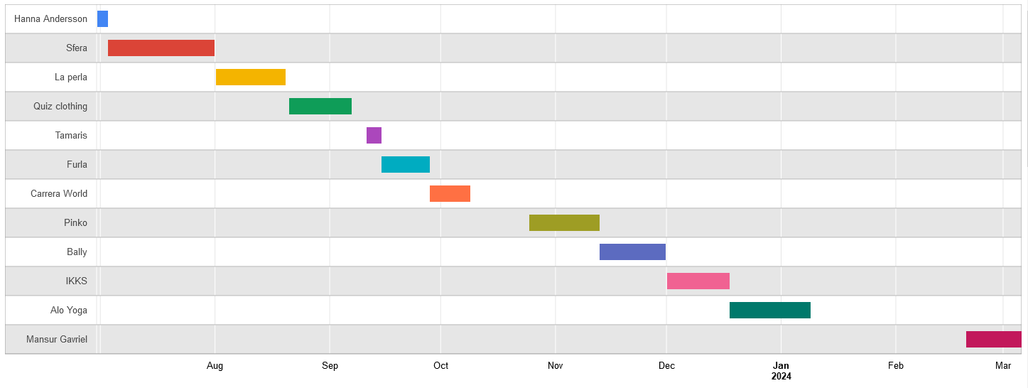 During our investigation, we managed to reconstruct a timeline that shows the duration of the various campaigns carried on by the group. Notably, the brands impersonated by the group predominantly operate within the fashion industry, with the majority being situated in Europe.