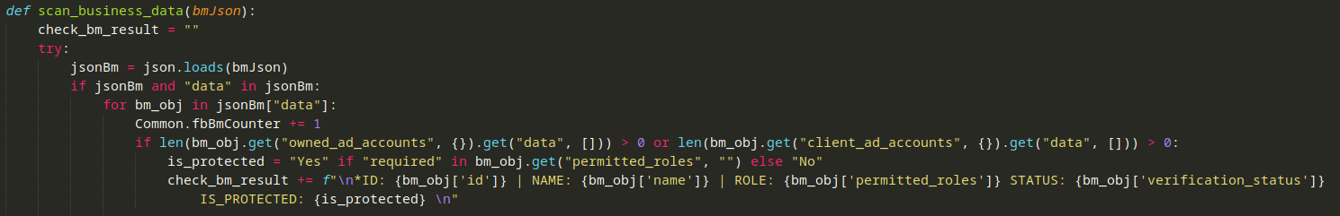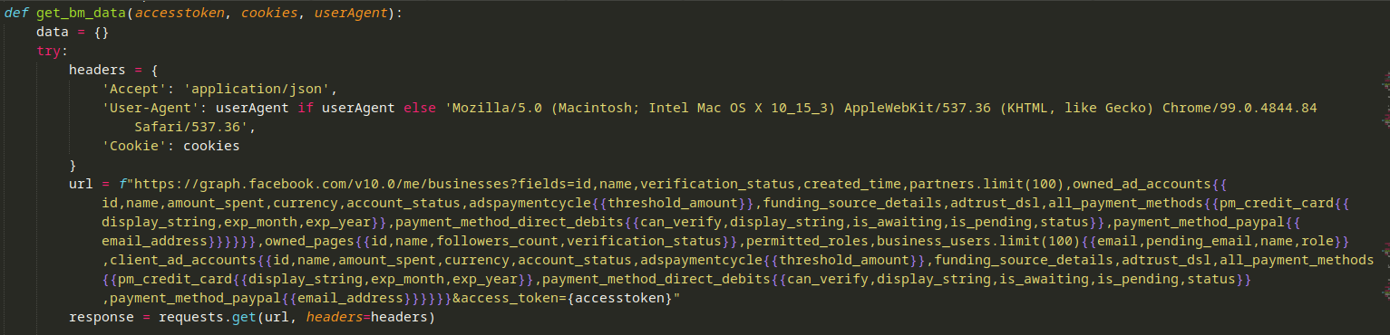 After extracting the browser data, the malware focuses on Meta Ads Manager credentials. These credentials receive an additional enrichment, by querying Facebook Graph APIs to obtain the available business manager accounts (BM), balance and budget for advertisement campaigns. This information is then categorized as “TKQC” (i.e., Tài Khoản Quảng Cáo, trad: Advertising Account) within the code and is saved separately in a .txt file before transmission to the Telegram channels.