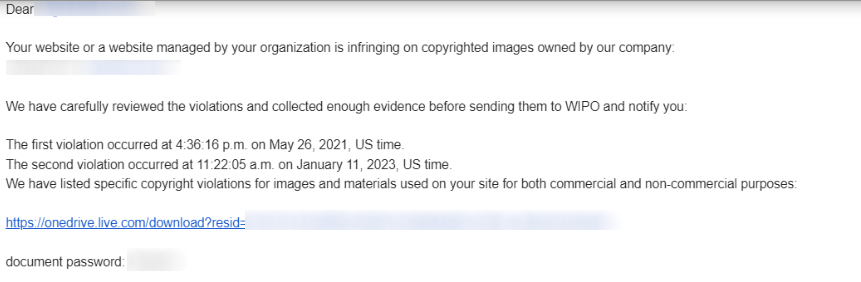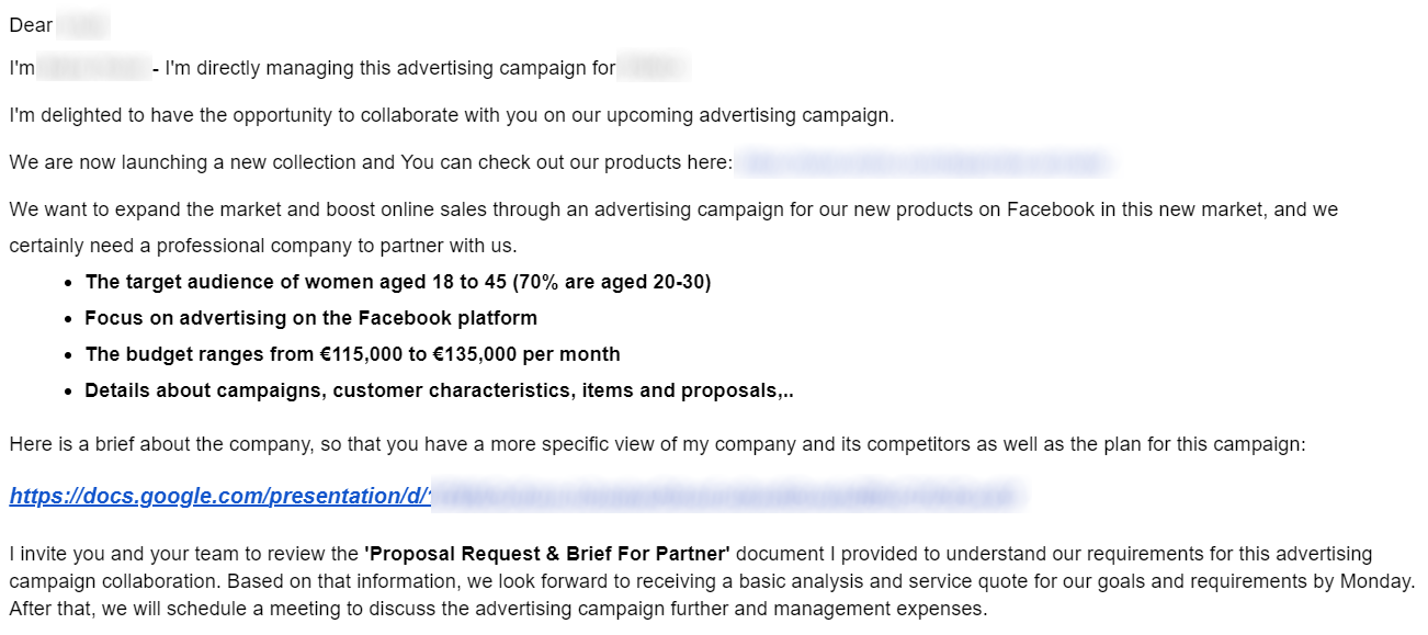In addition, leveraging LLMs, the attackers craft convincing phishing content that mimics legitimate collaboration offers from well-known fashion brands. We are also aware that, in a limited set of intercepted campaigns, the attackers are impersonating legitimate companies to accuse targeted digital marketing firms of copyright infringement.