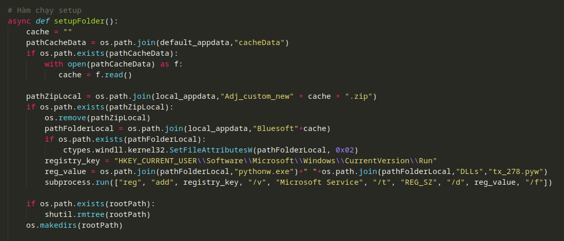 During dynamic analysis, it was found that the malware created a temporary directory named “BlueSoft” in the Appdata/Local directory. This naming convention aligns with the group’s tactics, likely chosen to blend in with legitimate software directories while conducting malicious operations. The name “BlueDuck” comes from the name of this folder (and one of the colors of the python logo) and the word “duck”, a common suffix for the names of other Vietnamese groups with similar TTPs.