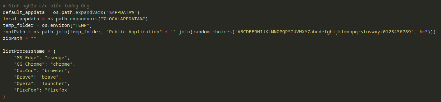 The malware targets user data stored within the following web browsers: Firefox, Chrome, Brave, Edge, Chromium, Opera, and CocCoc. It is worth noting that CocCoc is a Vietnamese browser not commonly used in the West (we definitely did not know of its existence), which suggests that the threat group may be from Vietnam. This hypothesis is supported by the comments in the python source code, mainly written in Vietnamese, and by a feature that specifically disables persistence and infection of hosts geolocated in Vietnam.