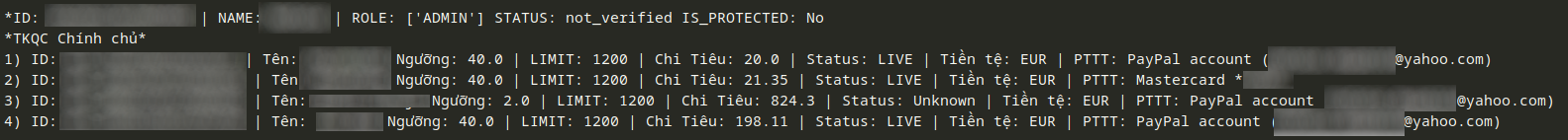 ID: {ad_id} | Tên: {ad_name} | Ngưỡng: {ad_billing_threshold_cycle} | LIMIT: {ad_daily_limit} | Chi Tiêu: {amount_spent} | Status: {ad_status} | Tiền tệ: {ad_currency} | PTTT: {payment_methods}