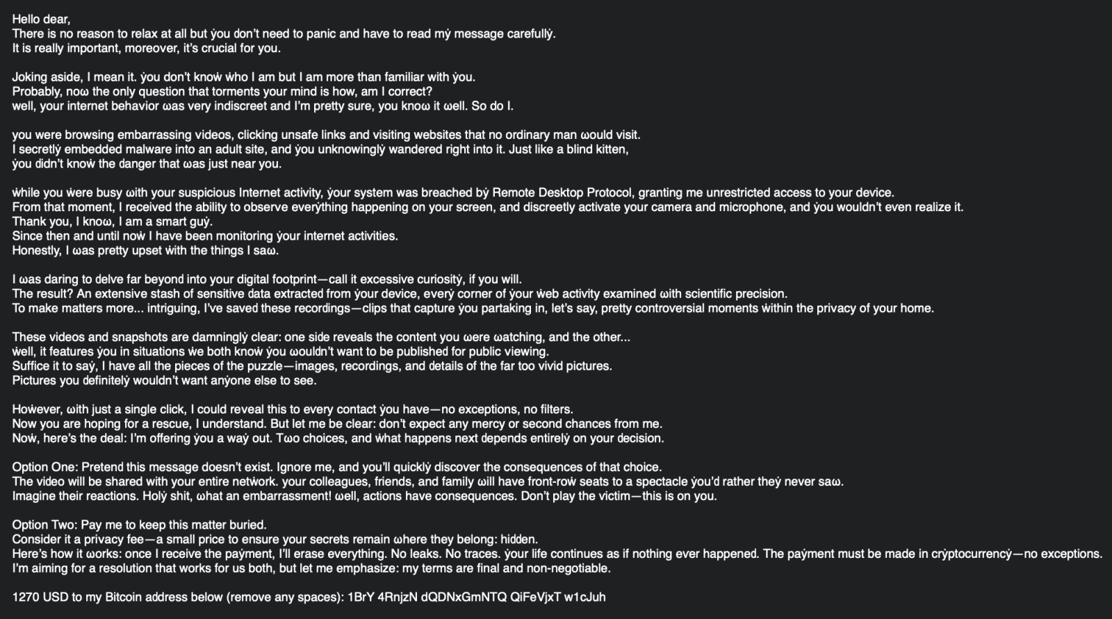 remnux@remnux:/MalwareZoo/20241231$ cat ocr-test.py import sys import pytesseract from PIL import Image image = Image.open(‘email.png’) extracted_text = pytesseract.image_to_string(image) with open(‘strings.txt', 'w') as file: file.write(extracted_text) remnux@remnux:/MalwareZoo/20241231$ python ocr-test.py remnux@remnux:/MalwareZoo/20241231$ head strings.txt Hello dear, There is no reason to relax at all but you don’t need to panic and have to read my message carefully. It is really important, moreover, it’s crucial for you. Joking aside, I mean it. you don’t know who I am but I am more than familiar with you. Probably, now the only question that torments your mind is how, am I correct? well, your internet behavior was very indiscreet and I’m pretty sure, you know it well. So do I. you were browsing embarrassing videos, clicking unsafe links and visiting websites that no ordinary man would visit. I secretly embedded malware into an adult site, and you unknowingly wandered right into it. Just like a blind kitten,