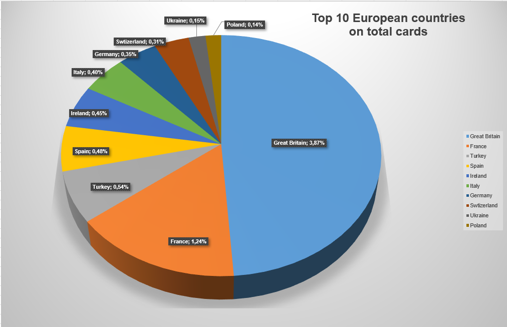As said before, the most affected country overall is USA. American cards placed on sale on Savastan0 are about 78 %.